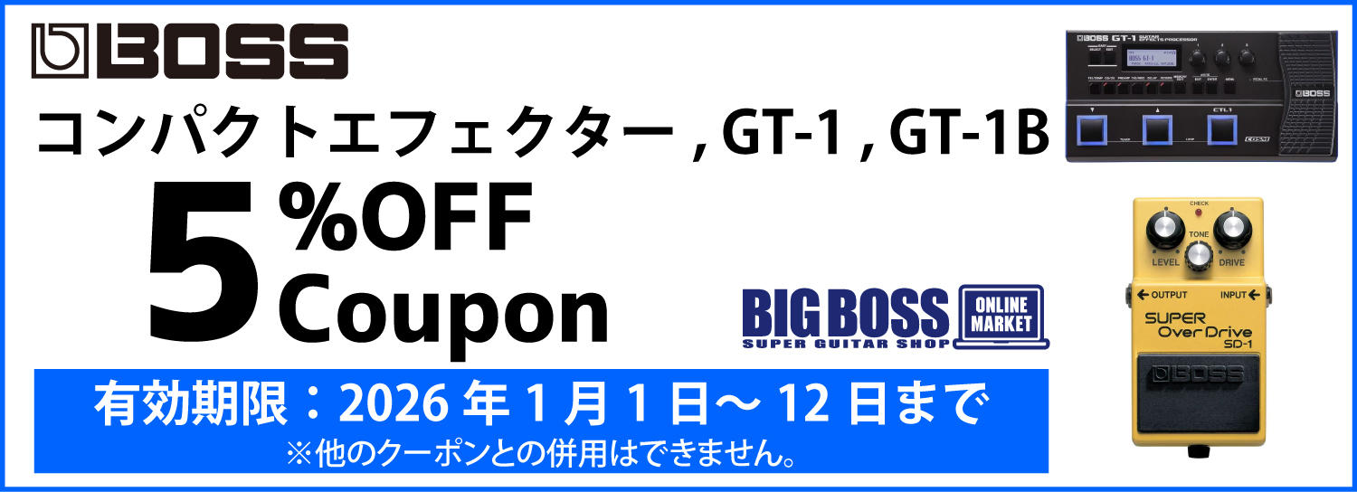 定番の BOSS コンパクトエフェクター各種、大人気マルチエフェクターの GT-1 と GT-1B を対象に、今だけ 5%OFFとなるクーポンをご用意いたしました!
