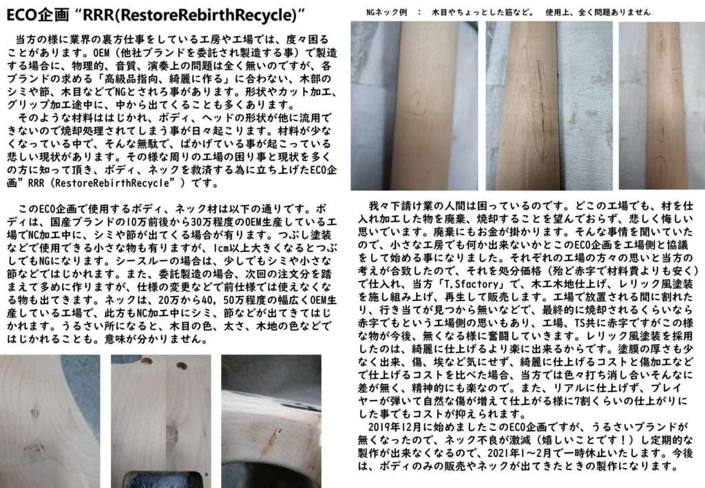 OEM生産している工場では、製作の時に相手の基準で選別されます。その際に「音的に」「物理的に」「質的に」何も問題が無いのですが「シミ」「節」「木目」などがメーカーやブランドの「基準」「イメージ」「ブランドの価値」に合わないという理由でNGとなり卸すことができず、形状なども他に流用できないので最悪な場合、焼却処分されている現状を知り、何とか出来ないかと立ち上げた企画。