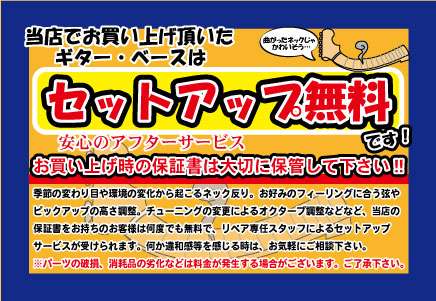 ネック調整はもちろん、弦高、電気系統チェック 、ブリッジの調整具合まで細部に渡りセットアップいたします。