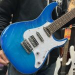 See Thru Blue Sunburstの鮮やかなカラーに、フレイムメイプルの杢目がしっかりと浮かび上がる一本です。