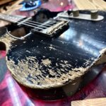 このギターの一番の魅力と言えば、この超ド派手なエイジド加工です。カラーはシンプルなブラックカラーで下地無しでSuper Heavy Agedオプションをセレクトする事でよりハードなルックスに仕上がると思いましてオーダーしてみました。ヴィンテージっぽいリアルなエイジド加工というよりはライブハウスでハードコアバンドのギタリストにガンガン使い込まれて付いた傷、ここ10年くらいで超絶ハードに使い込みましたって感じのテーマ性ですね。ピックガードを外して使ってもカッコいいかも....