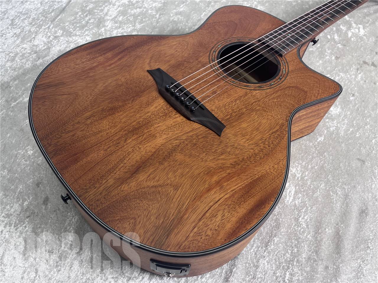 ソリッドマホガニー・トップと厳選されたマホガニー合板のバック&サイドを組み合わせています。