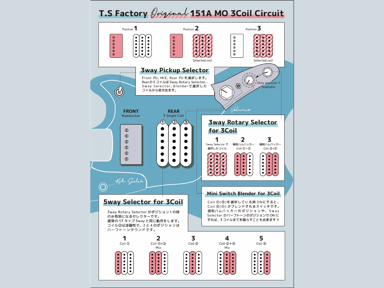 コイルの組み合わせにより様々な音色の切り替えが可能なオリジナルの 3Coil ピックアップを搭載した「151A-MO」モデルです。