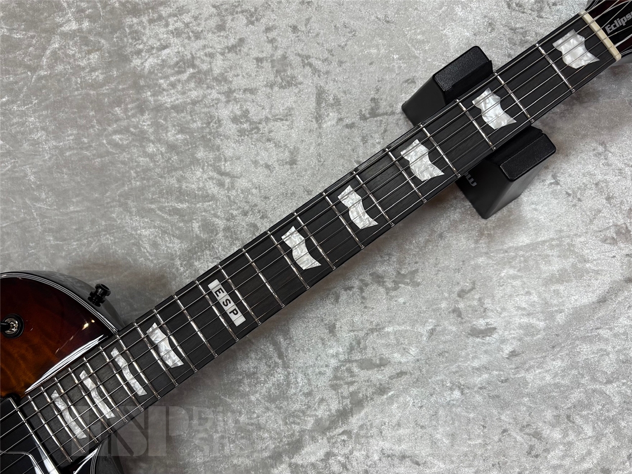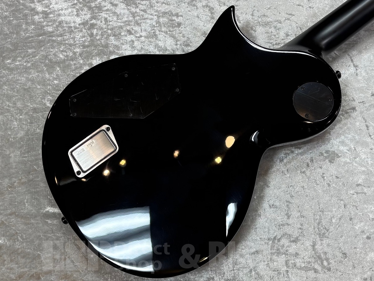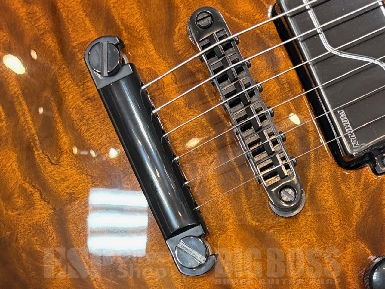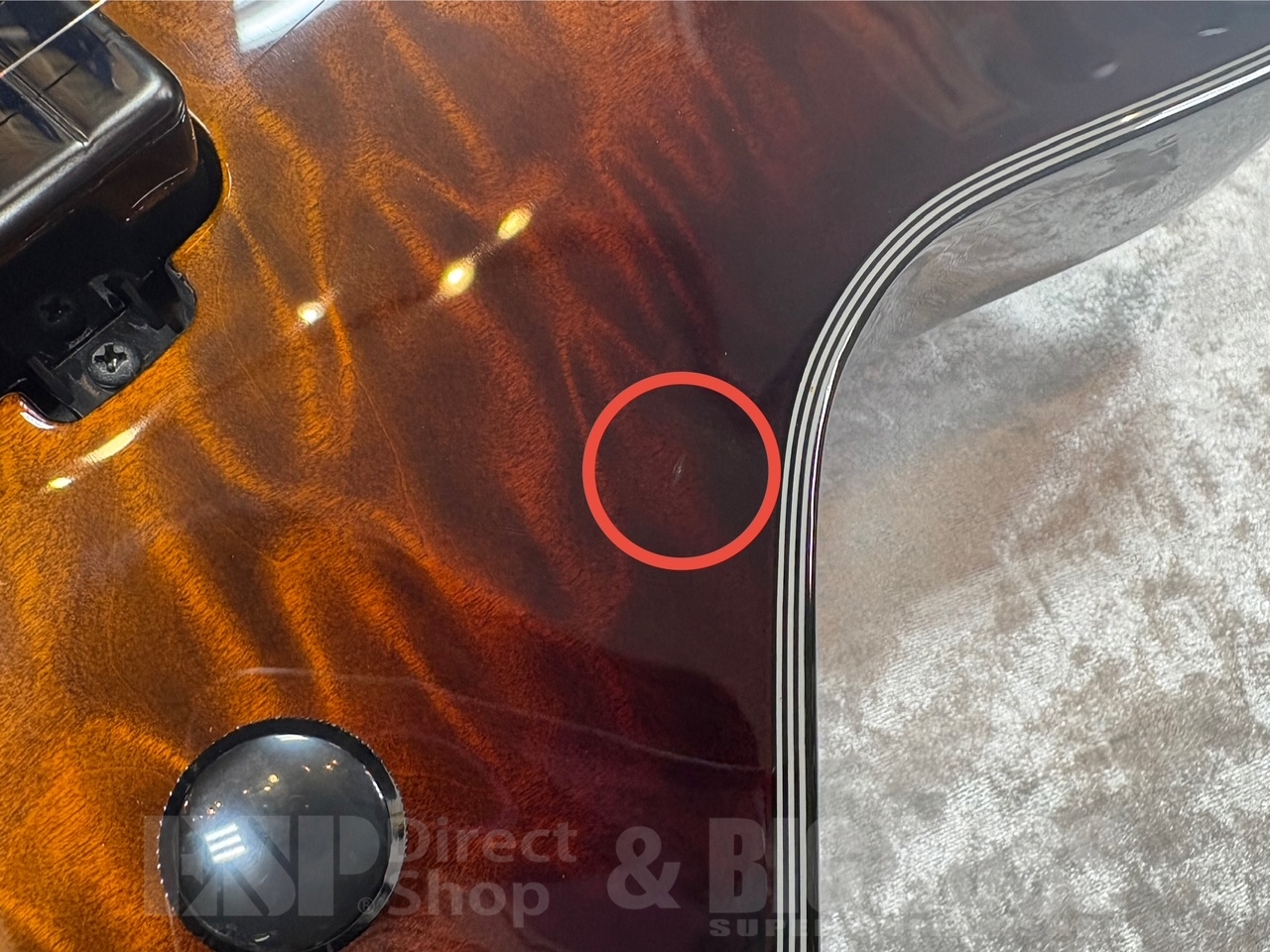 マホガニーに美麗なキルテッドメイプルがラミネートされたボディ、マホガニーネック、フラッグインレイの入ったエボニー指板になります。ボディへはセットネック方式でジョイントされていますが、ヒール部は滑らかに加工されていますので、ストレスを感じさせません。