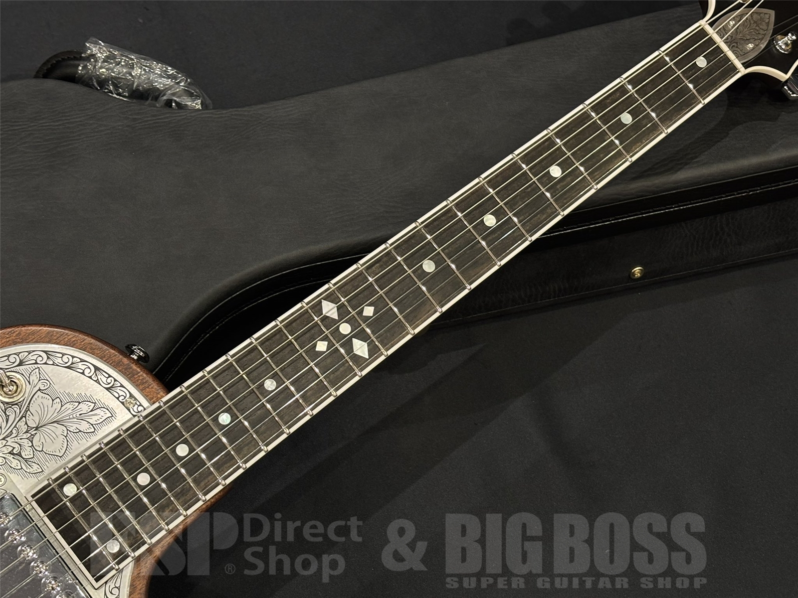 同様にアルミ合金を用いたヘッドのダイアモンド・エンブレム、トラスロッド・カバー、テイルピースやピックアップ・リングをはじめ、アウトプット・ジャック・プレート、コントロール&スイッチ・バック・プレートに至るまで彫金を施しています。