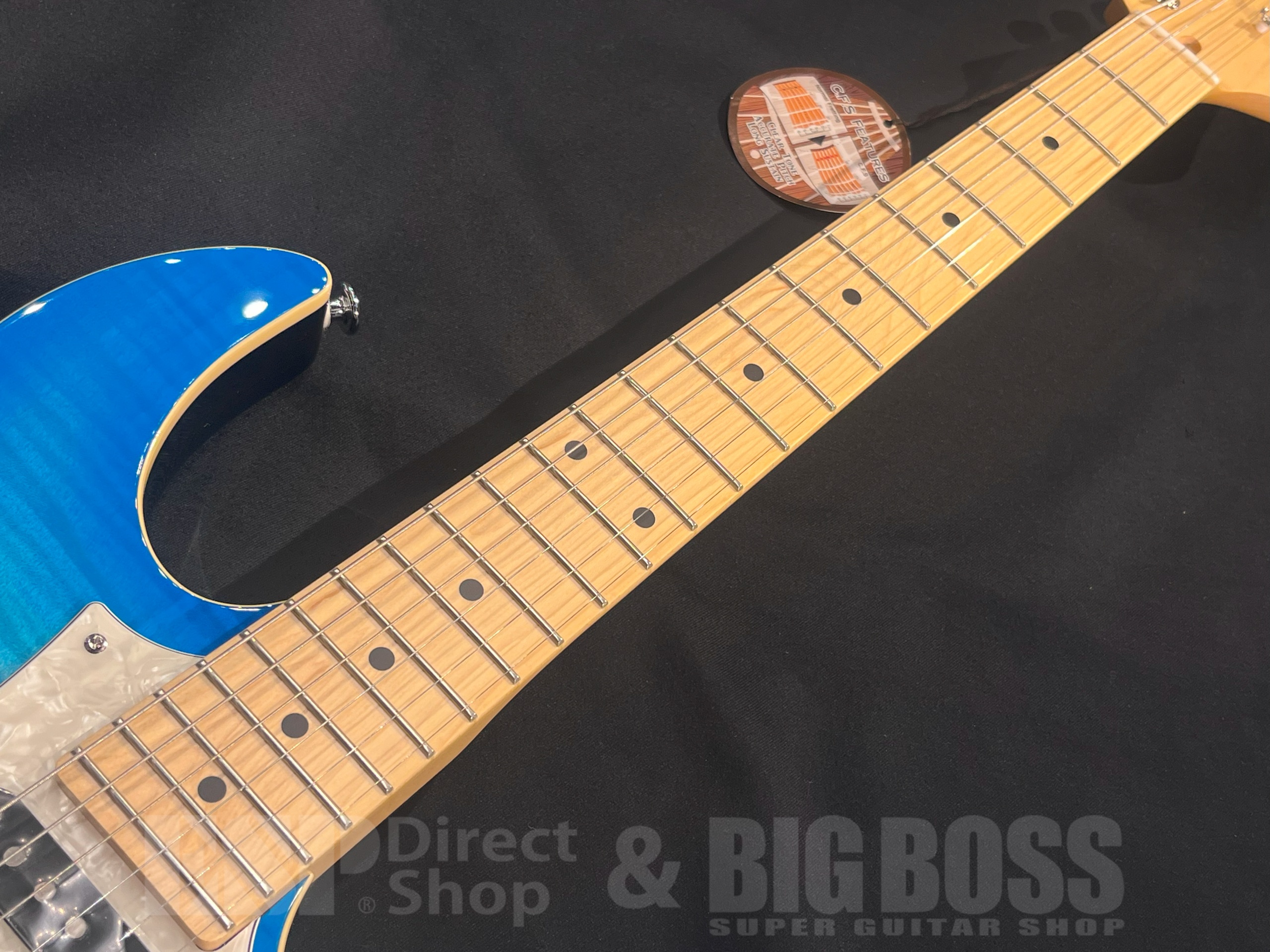 当モデルは、フレイムメイプルの化粧板+バスウッドボディ、メイプル指板、オーシャンバーストカラーという組み合わせ。