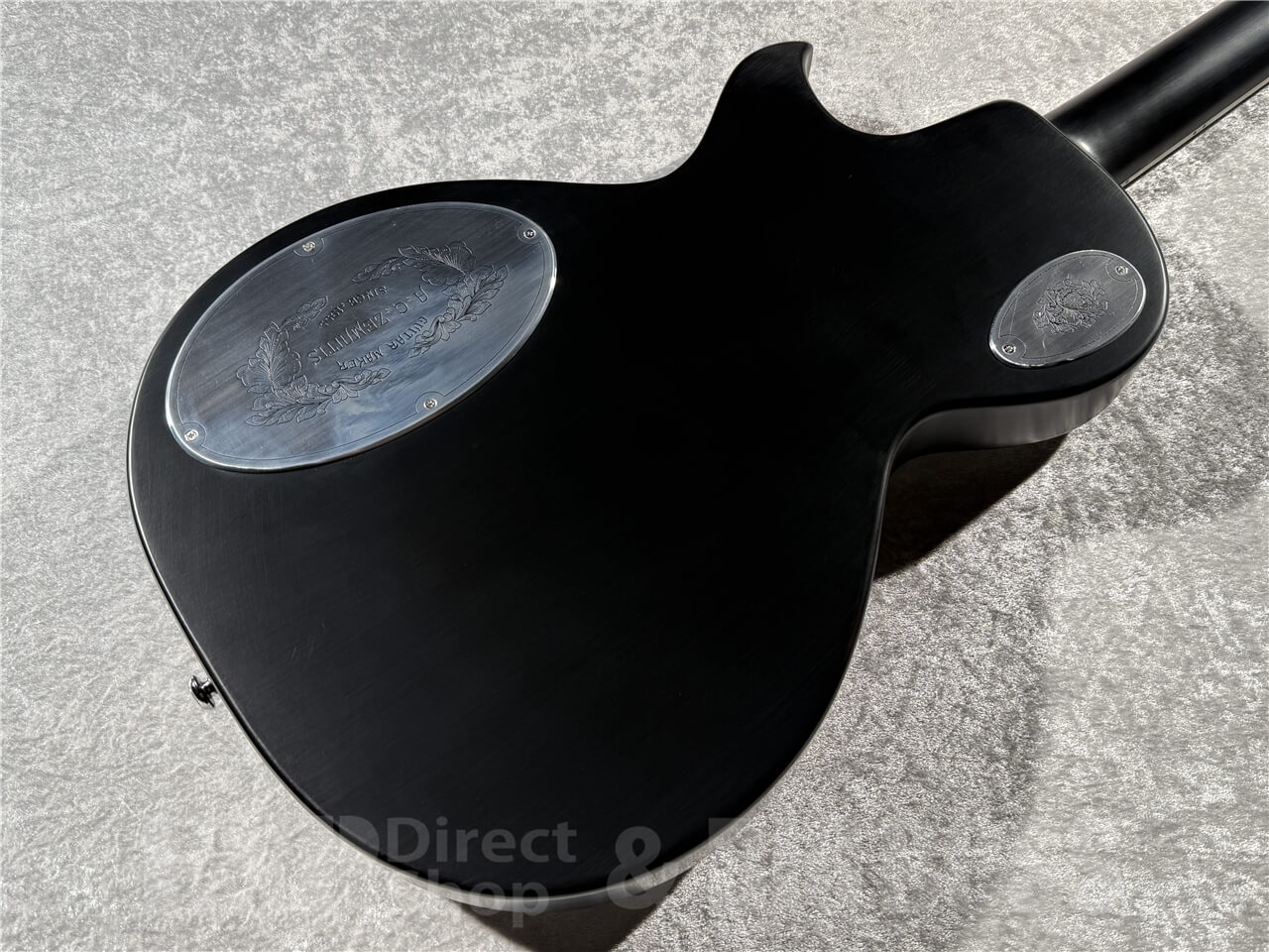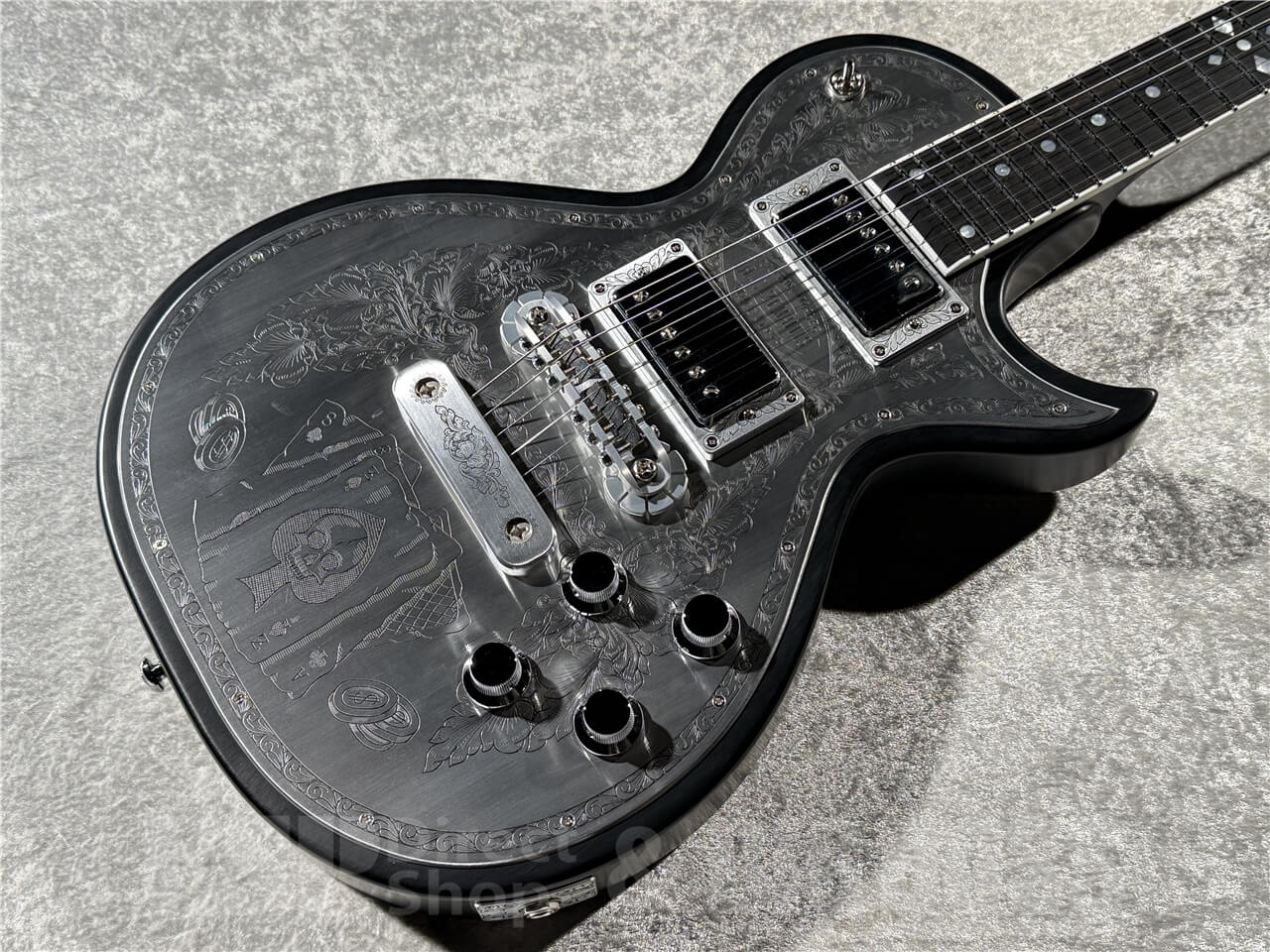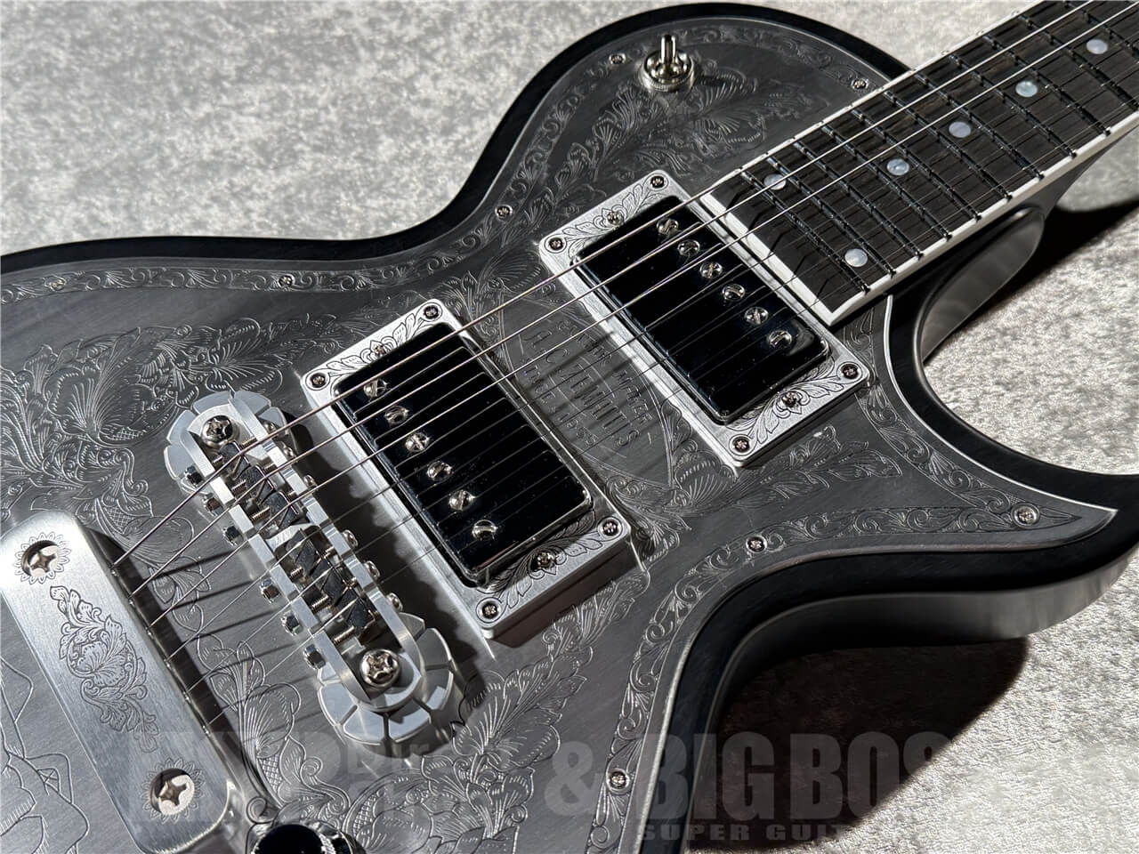 同様にアルミ合金を用いたヘッドのダイアモンド・エンブレム、トラスロッド・カバー、テイルピースやピックアップ・リングをはじめ、アウトプット・ジャック・プレート、コントロール&スイッチ・バック・プレートに至るまで彫金を施しています。