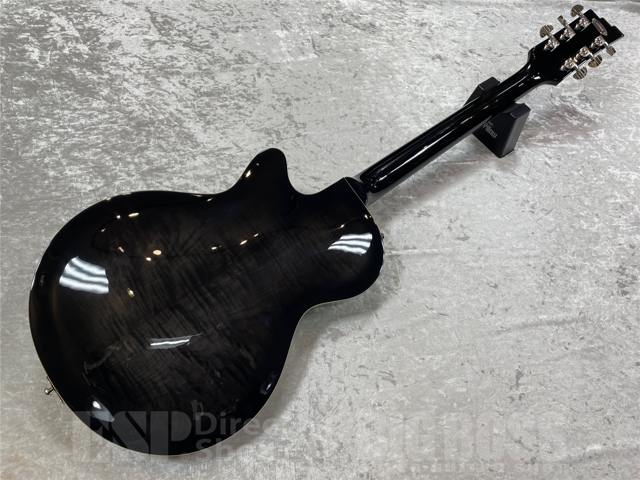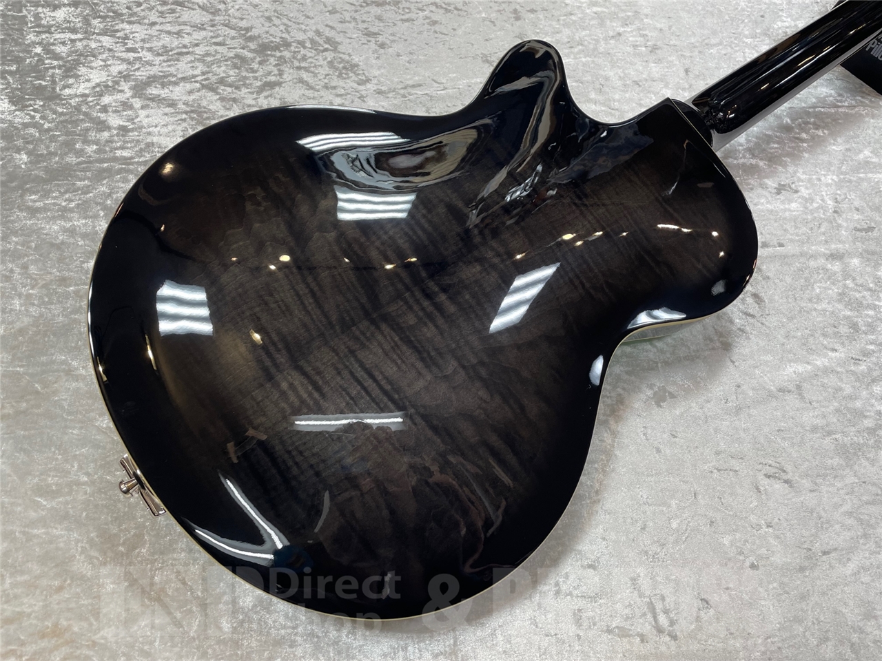 今回ご紹介するのは、デューセンバーグの中でも代表的なモデルのスタープレイヤーシリーズ。高級感と、上品さ、ロックなスタイルを取り込んだセミアコースティク(セミホロウ)構造の一本です。ボディトップと、バック共にアーチ加工が施されており、ボディバックには杢目の美しいフレイムメイプルが採用されています。
