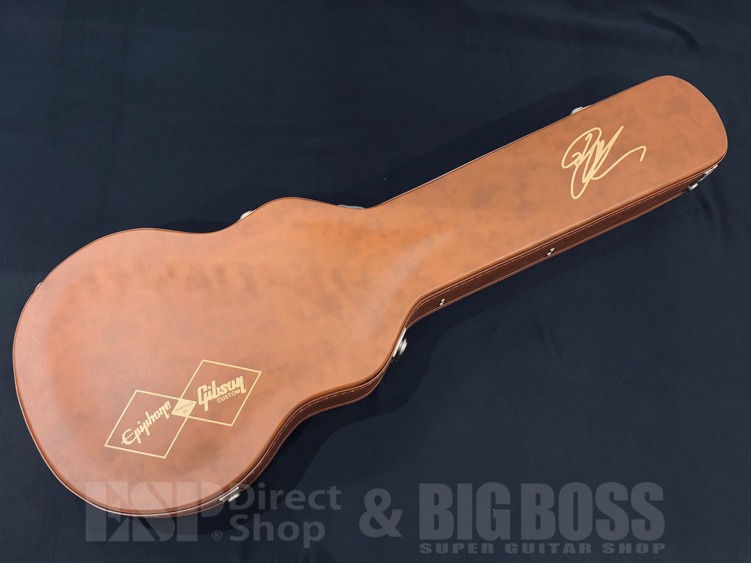 Inspired by Gibson CustomロゴとTAKのサインのレプリカがケース外側に描かれたヴィンテージスタイルの茶色(内張りはピンク)のハードシェルケースも付属します。