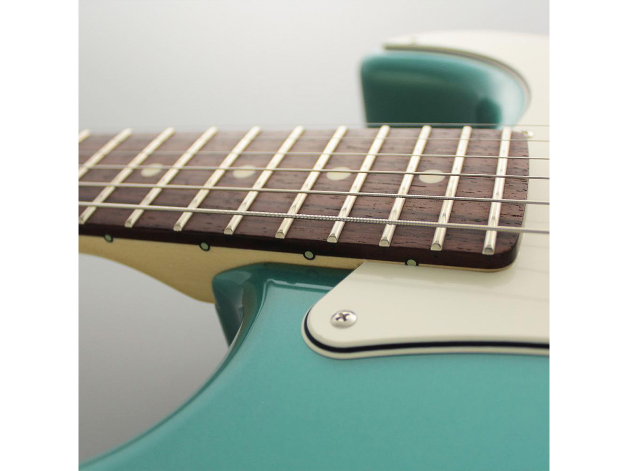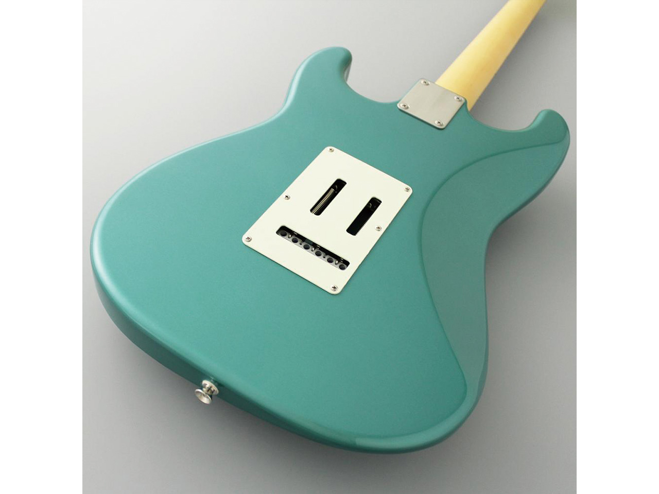当モデルは、アルダーボディ、ローズウッド指板、SSH配列、オーシャンターコイズメタリックカラーという組み合わせ。