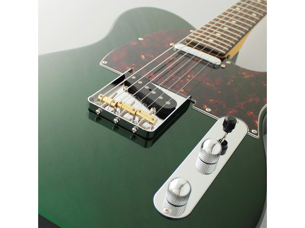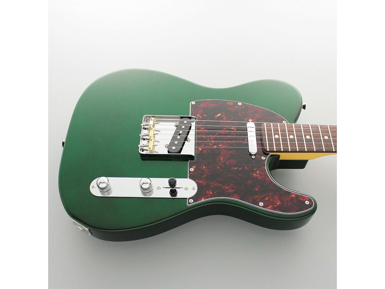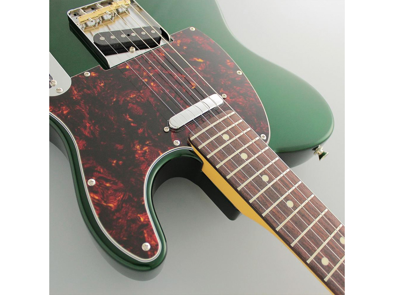 当モデルは、アルダーボディ、ローズウッド指板、キャンディアップルグリーンカラーという組み合わせ。