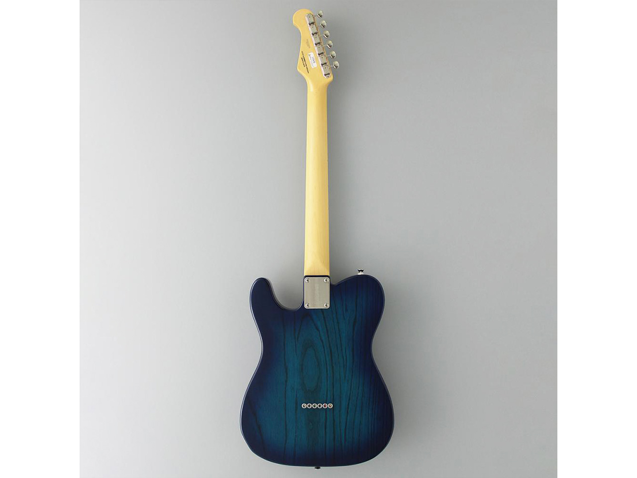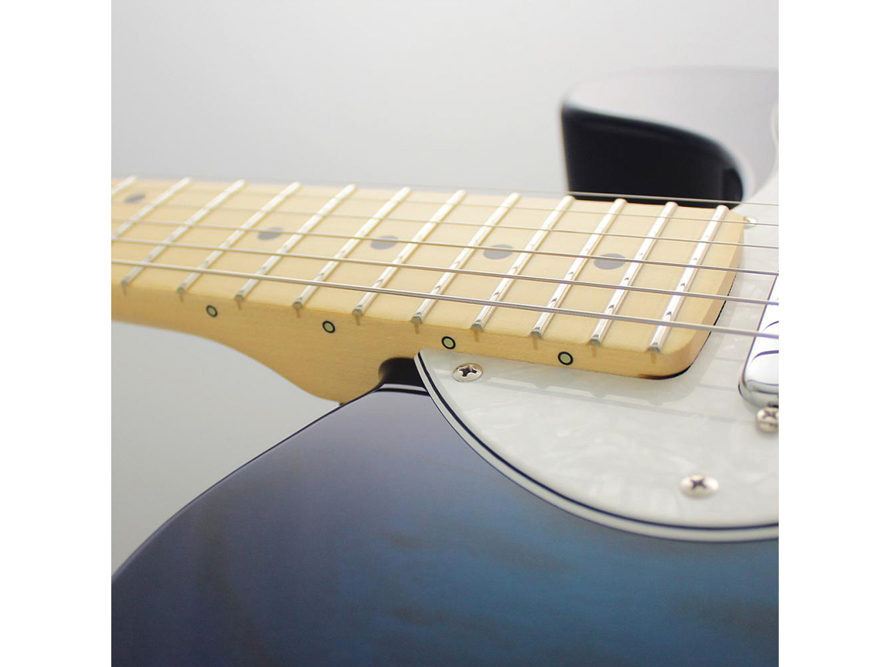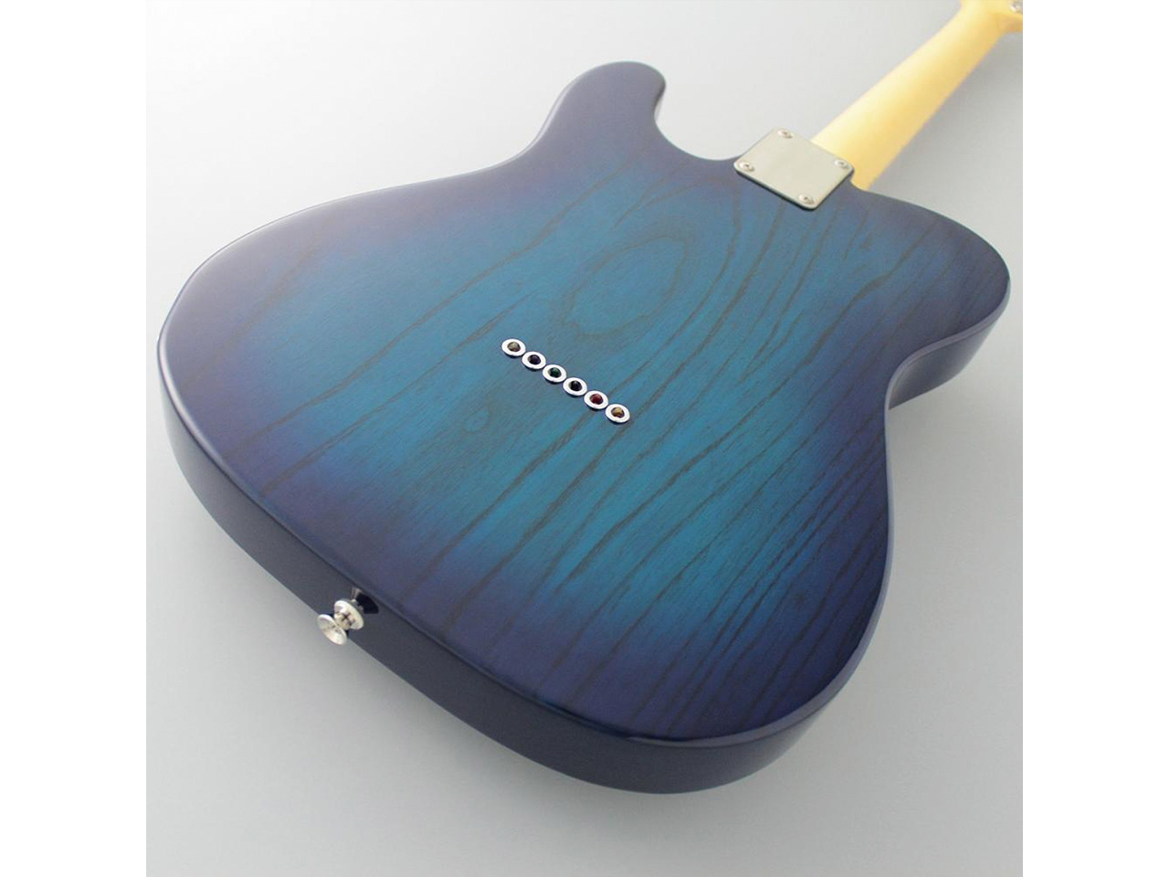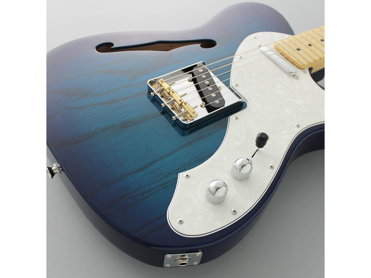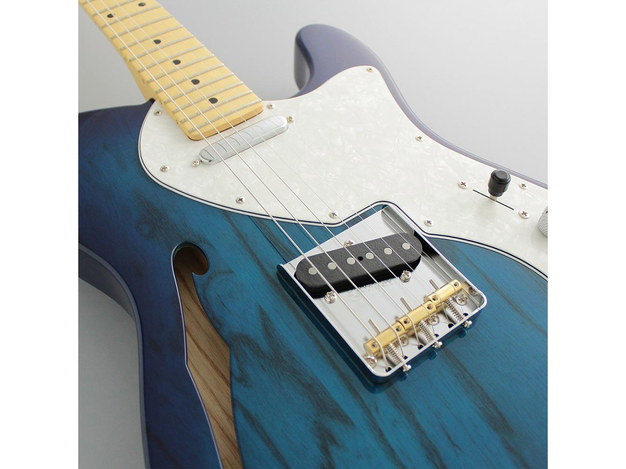 当モデルは、セミホロウ構造のアッシュボディ、メイプル指板、シースルーブルーバーストカラーという組み合わせ。