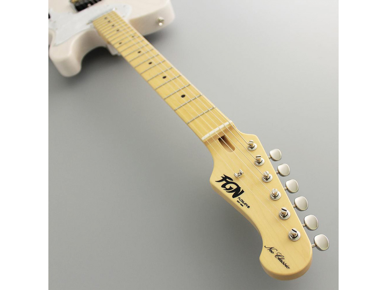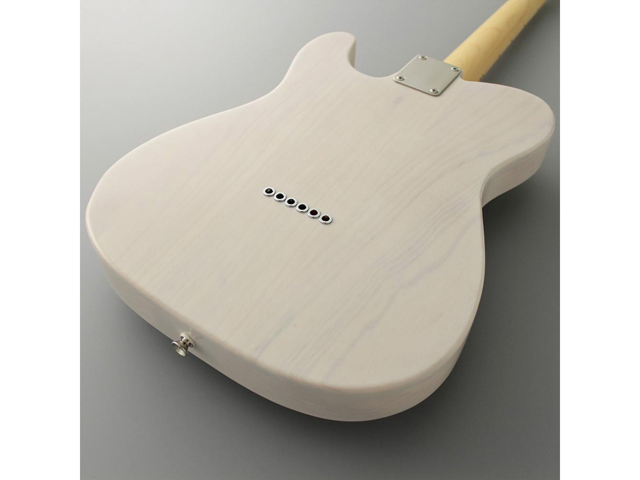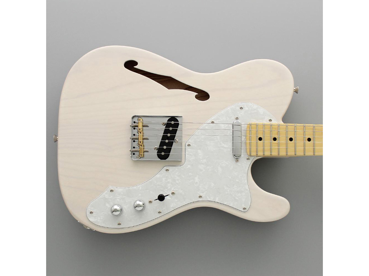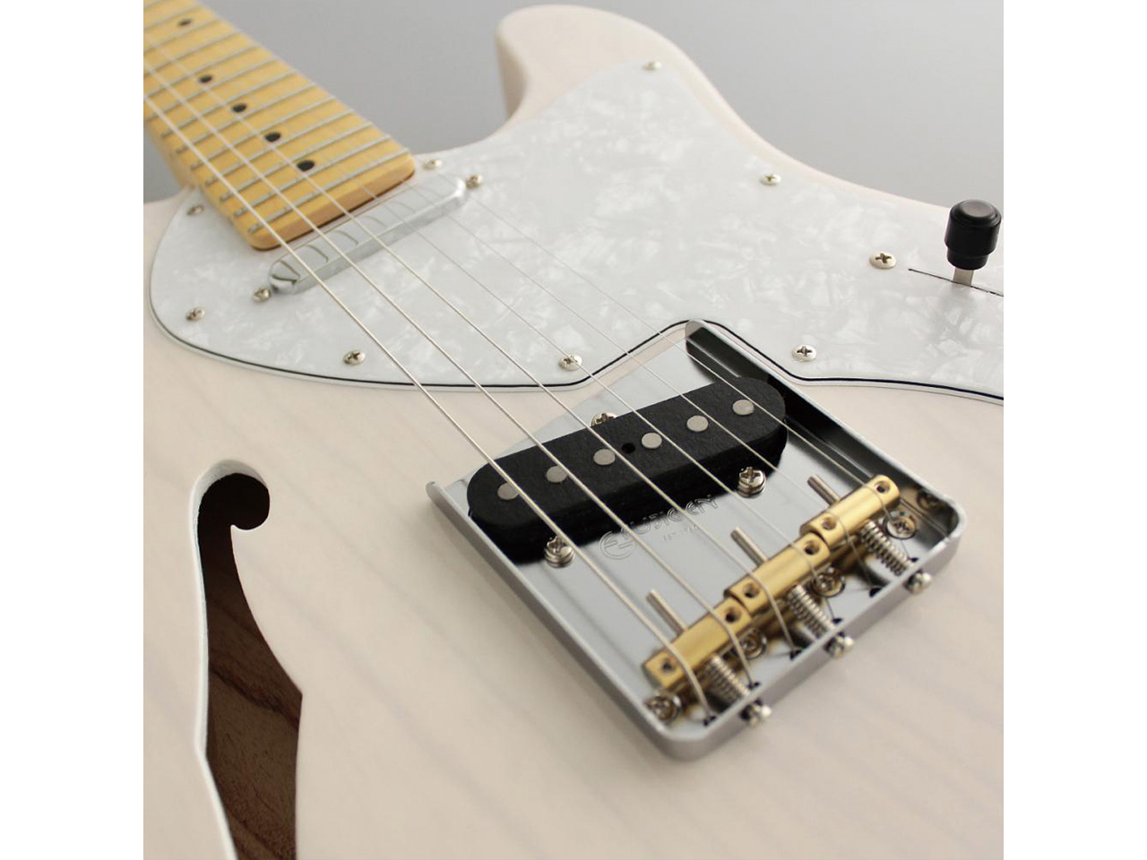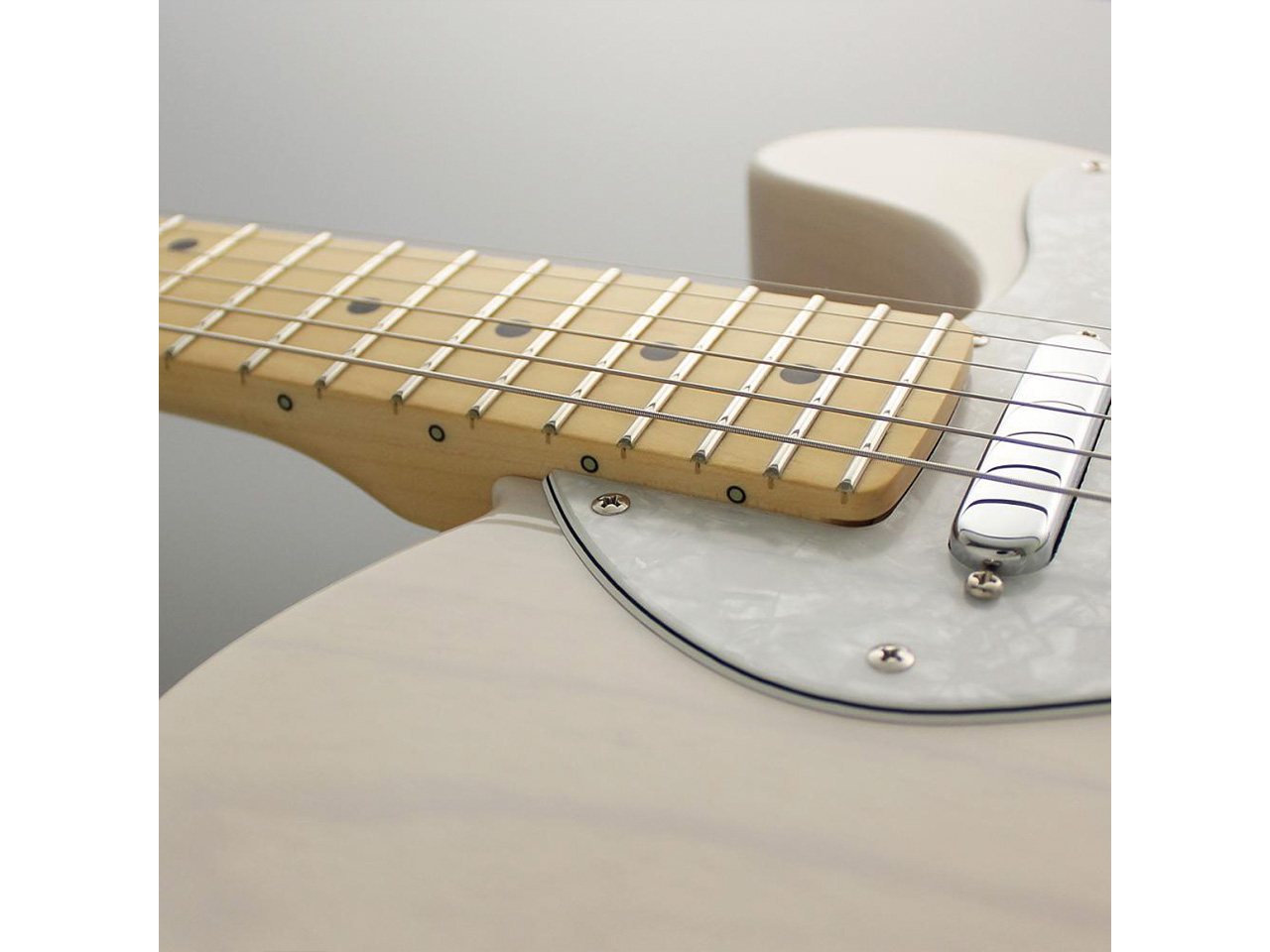 当モデルは、セミホロウ構造のアッシュボディ、メイプル指板、ホワイトブロンドカラーという組み合わせ。