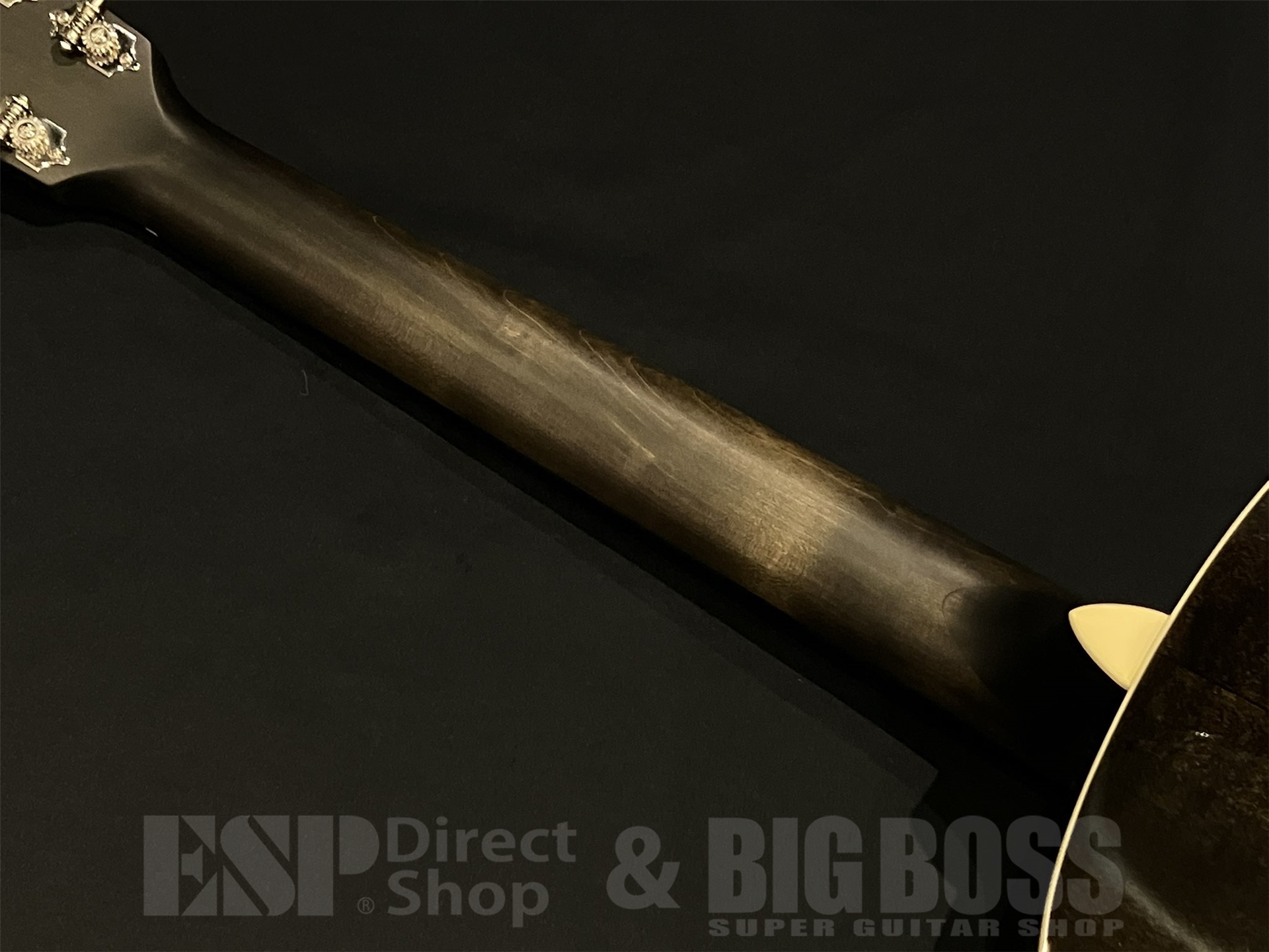 シトカスプルース単板トップに、美しいフレイム杢と抜群のレスポンスが魅力のメイプル単板サイドバック、マホガニーネックにローズウッド指板という本格的な材料スペックを採用。