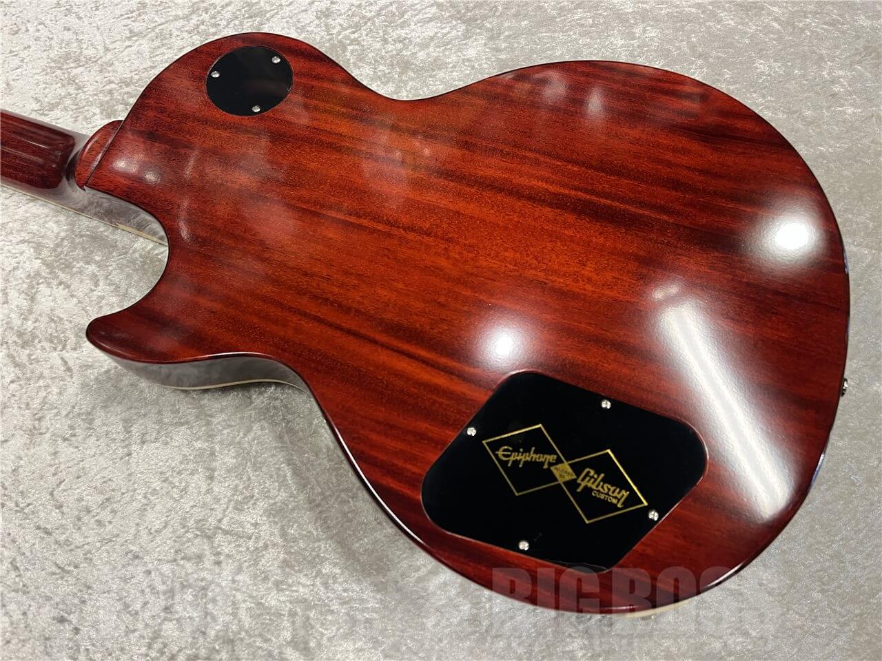 本モデルでは、ワンピース・マホガニー・ネック(ロング・ネック・テノン仕様)を採用し、豊かなサステインを実現。スリムテーパー™・ネック・プロファイルにより、スムーズな演奏性を提供します。さらに、バインディングが施されたローズウッド指板、マザー・オブ・パールのトラペゾイド・インレイ、エイジド加工を施したEpiphoneロゴ、ゴールドでシルクスクリーン印刷された「Les Paul Model」の文字が入ったギブソン・スタイルの“オープンブック”ヘッドストックを採用。サイド・ドットの位置やサイズも、1960年当時のLes Paul Standardと同じ仕様になっています。ジェニューイン・マホガニー材のボディにメイプル・トップが貼られ、トップには美しいAAAフレイムメイプル化粧板があしらわれています。