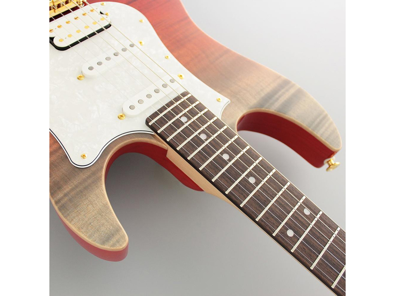 当モデルは、フレイムメイプルトップ・アッシュバックボディ、ローズウッド指板。
