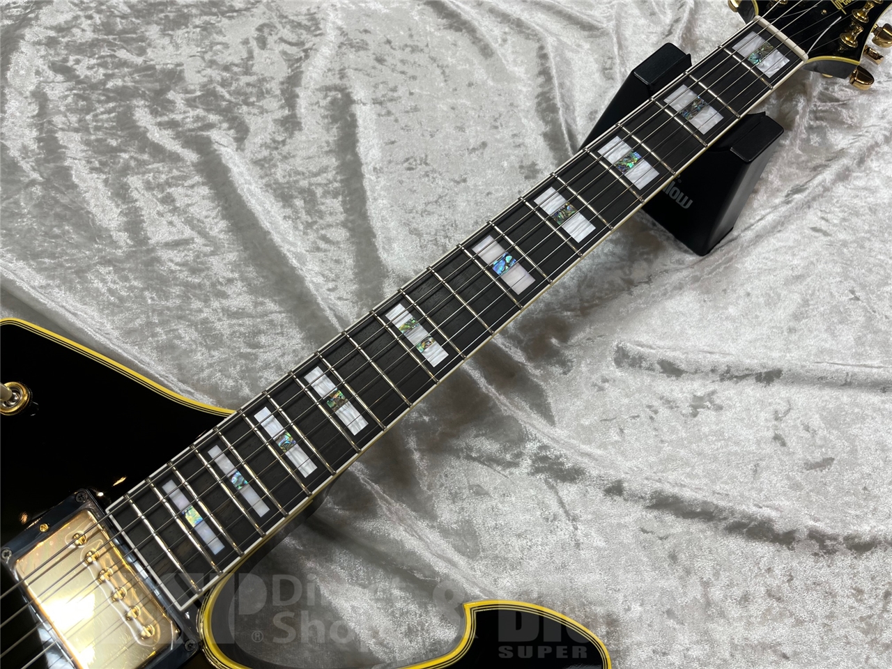 フィンガーボードはエボニーでアバロンとパーロイドを組み合わせたブロック・ポジション・マークは高級感を演出します。