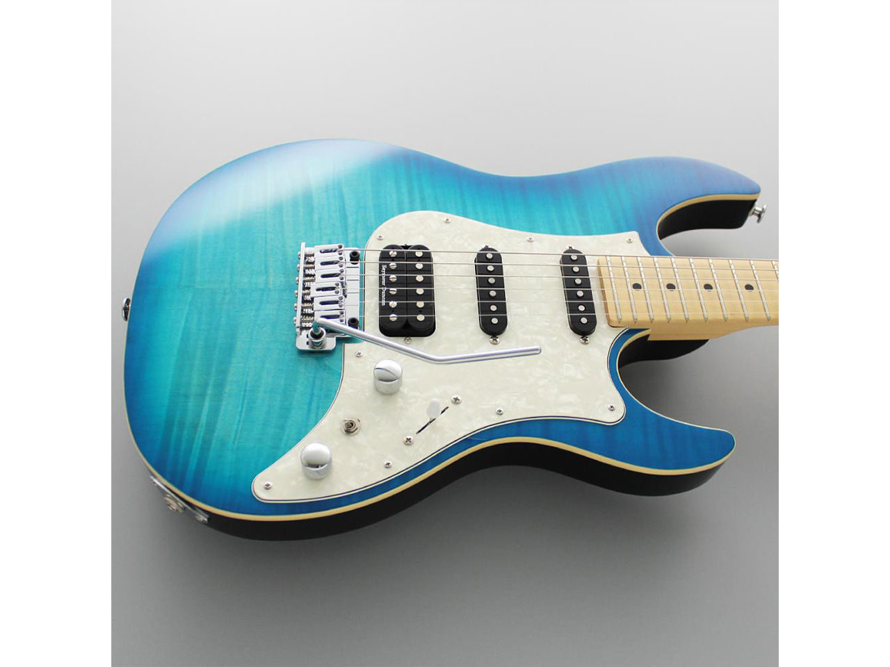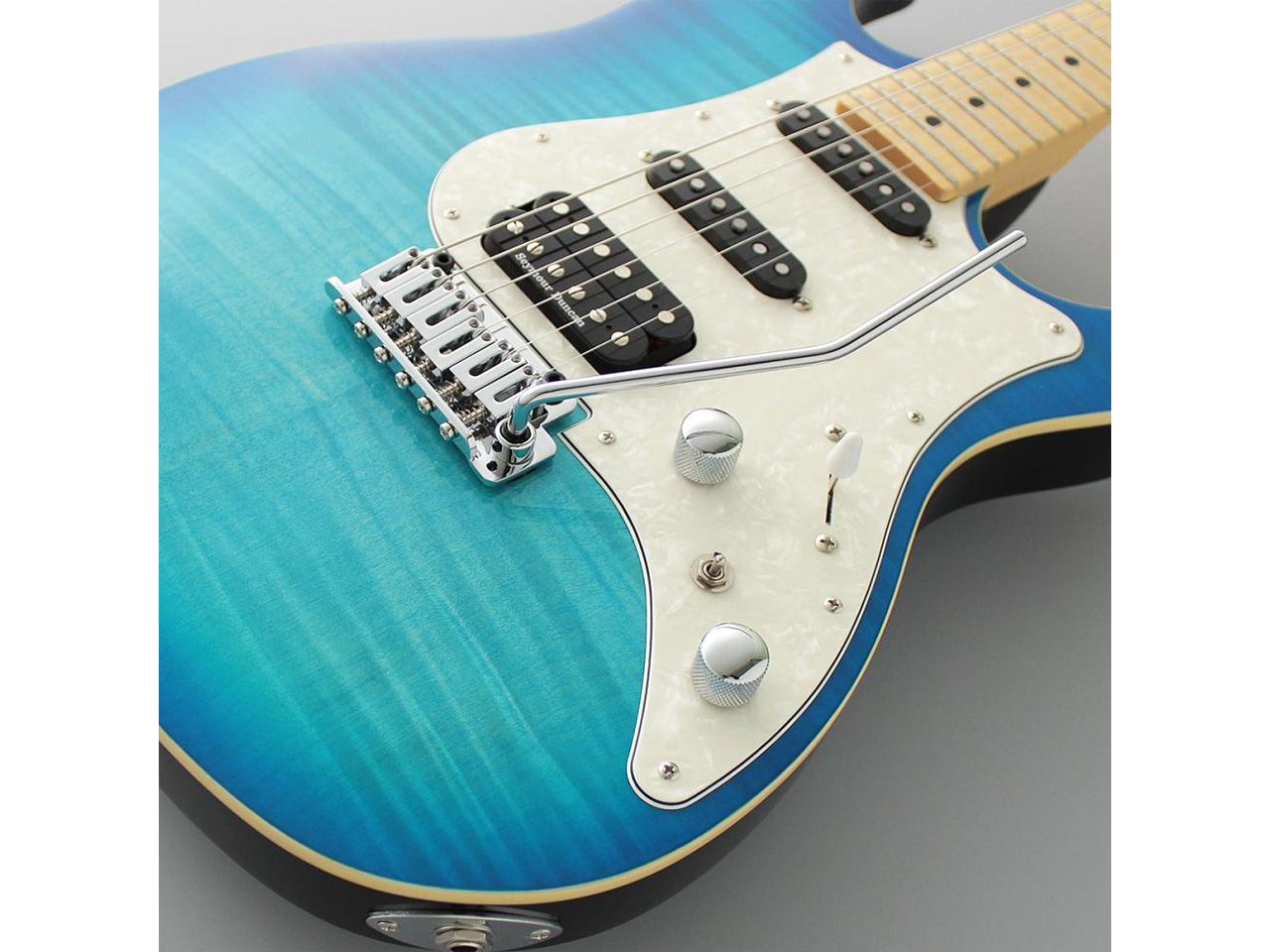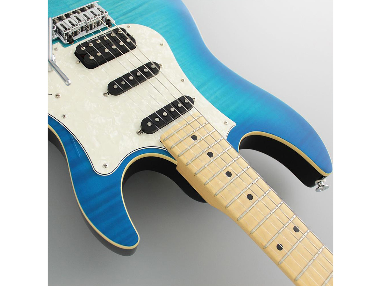 当モデルは、フレイムメイプルの化粧板+バスウッドボディ、メイプル指板、オーシャンバーストカラーという組み合わせ。