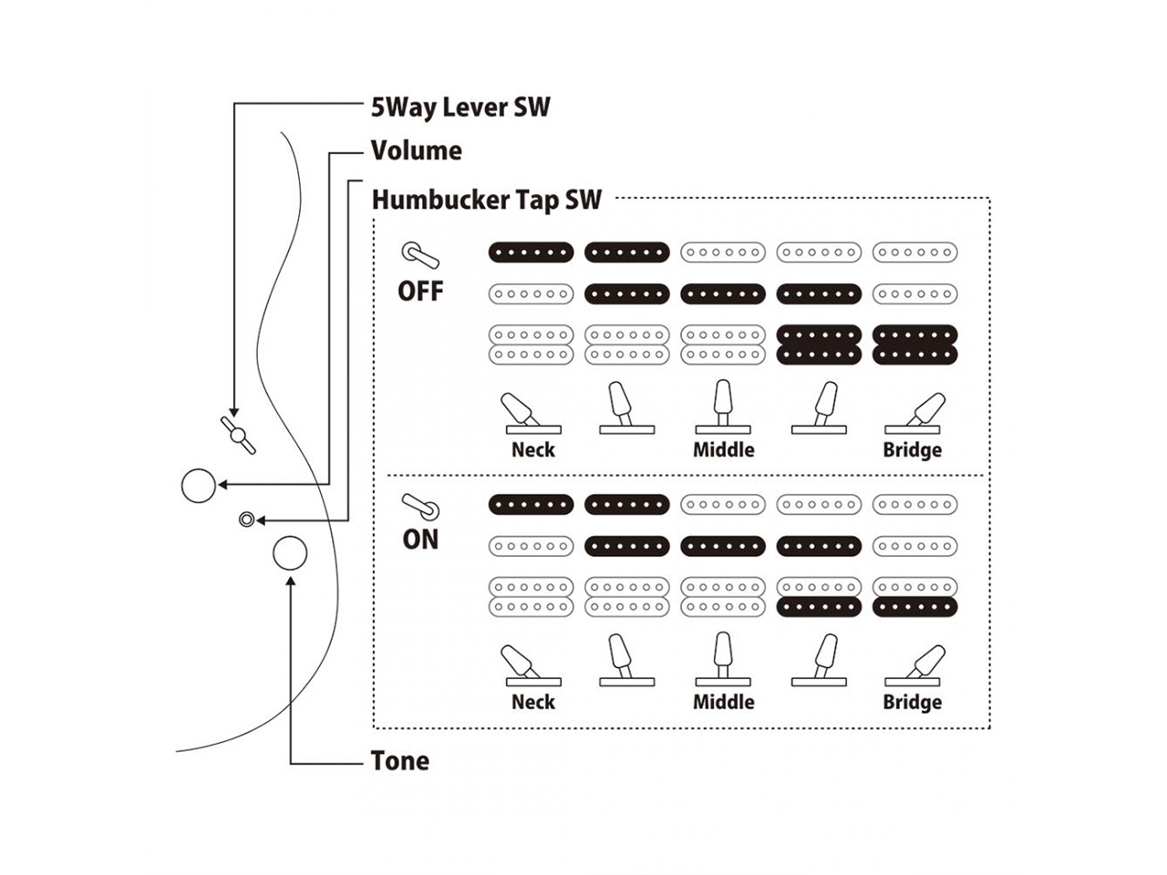 Controls:1Volume, 1Tone, 5Way Lever SW, Coil Tap Mini SW
