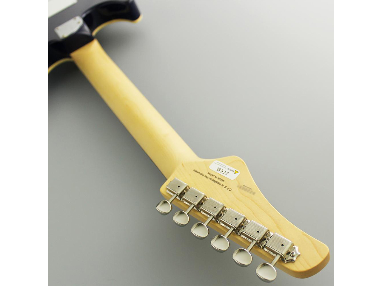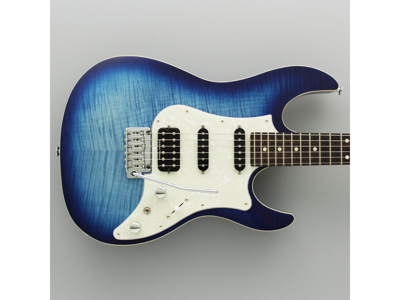 当モデルは、フレイムメイプルの化粧板+バスウッドボディ、ローズウッド指板、ジーンズバーストカラーという組み合わせ。