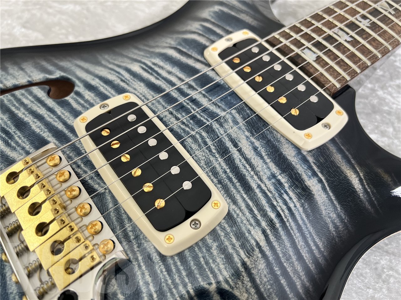 本モデルには10-Topグレードのフィギュアド・メイプル・トップ、マホガニー・バック&ネック、ジリコテ指板を使用し、全てPRS独自の木材乾燥プロセスを経て、環境の変化に強く安定したネックと、弦振動を最大限に活かすボディとなっています。さらに、Fホールを兼ね備えたセミホロウ構造を採用することで、エレガントなルックスに加え、深みと奥行きのある上質なトーンを生み出します。