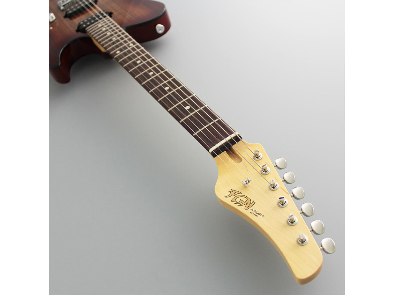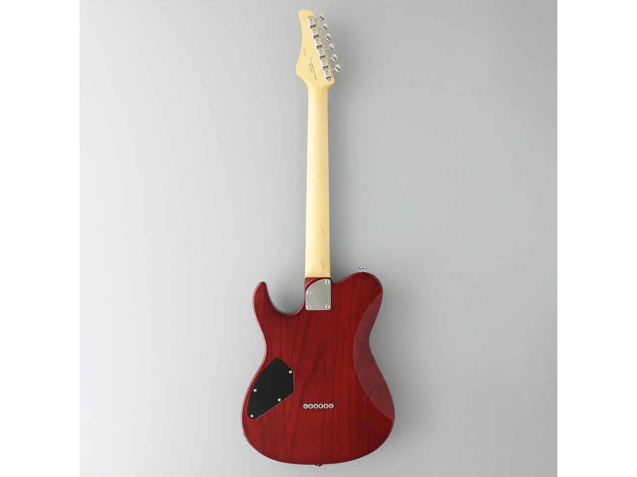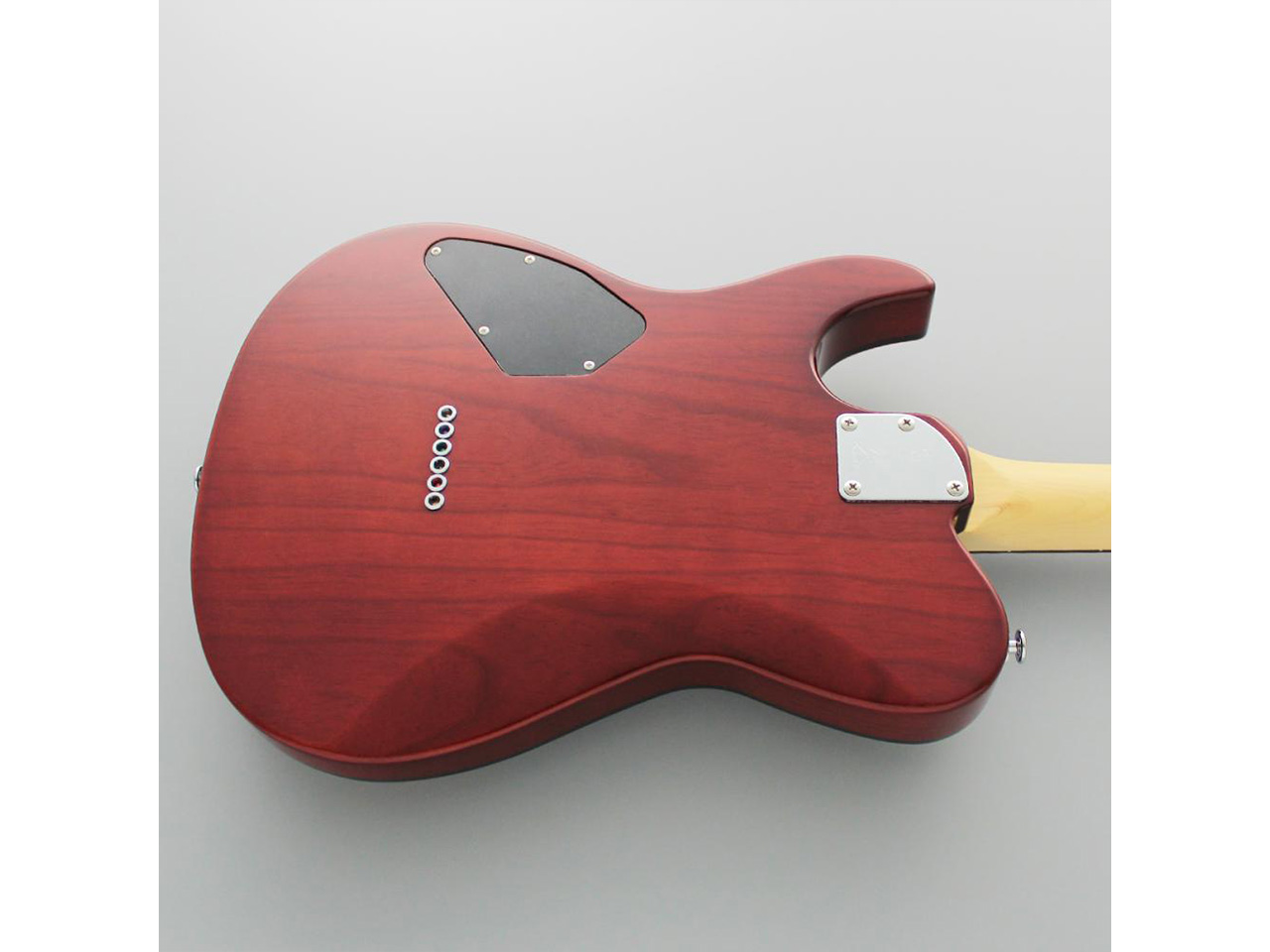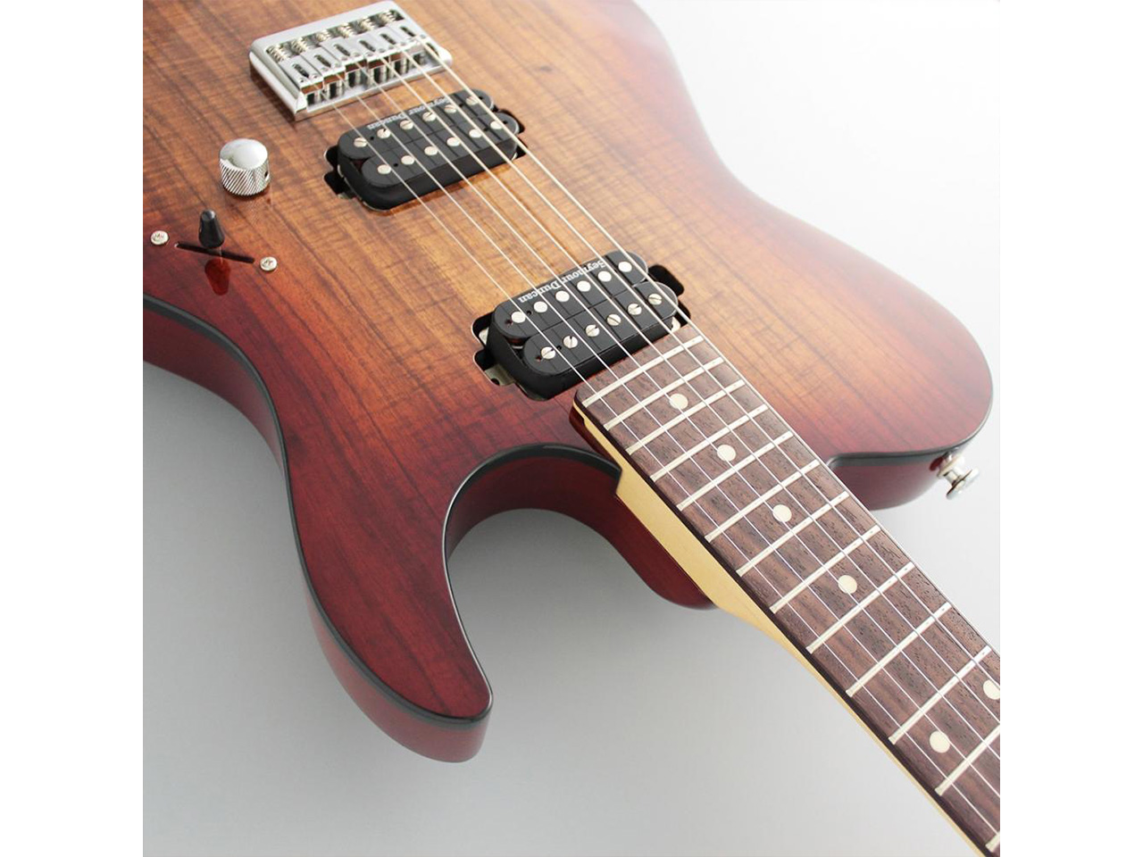 当モデルは、アカシアコアの化粧板+アッシュボディ、ローズウッド指板、コアナチュラルバーストカラーといった組み合わせ。コア材に合わせて調色された新カラーが渋く、とても魅力的です。ピックガードレス仕様にしたことで、よりその魅力をお楽しみいただけます。