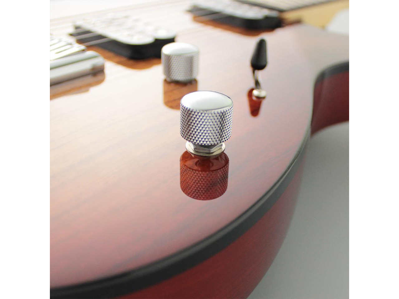 コントロールは、1ボリューム・1トーン・3WAYレバースイッチ。TONEポットはプッシュプルSWになっていて、それぞれのハムバッカーピックアップをコイルタップすることができます。これとボリュームやトーンを駆使することで、じつに幅広いサウンドメイキングが可能です。