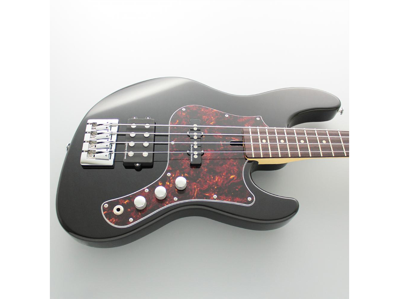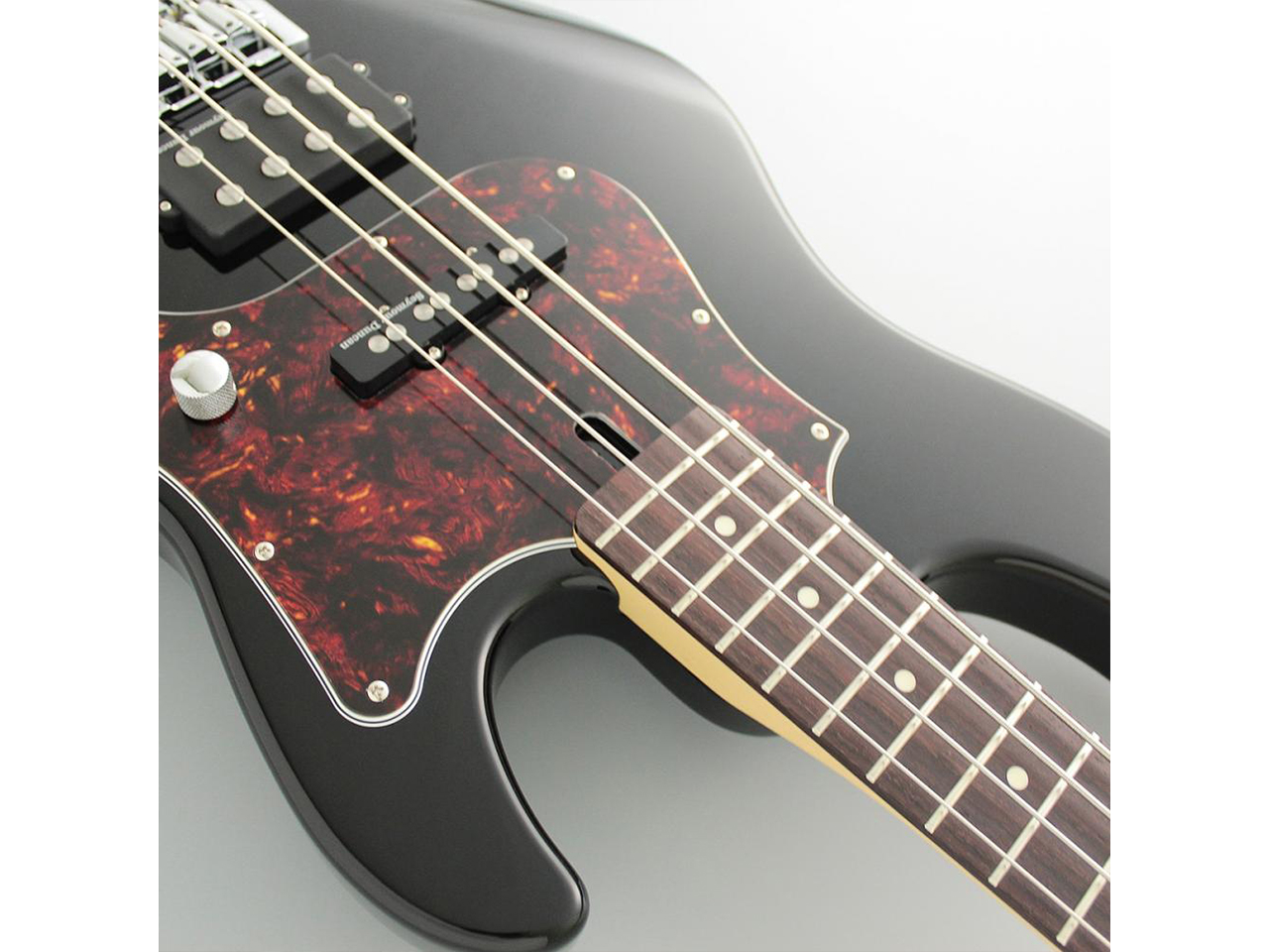 配列は、フロントにJタイプ、リアにMMタイプの組み合わせ。TONEポットのプッシュプルSWは、リアPUのコイルタップ機能になっており、ポットを引き上げることで擬似的にシングルPUのようなサウンドとなります。これにより、ピックアップ1発のMMタイプのように粘りのあるサウンドも出せますし、タップしてJBタイプのように歯切れのよいサウンドも出すことができます。