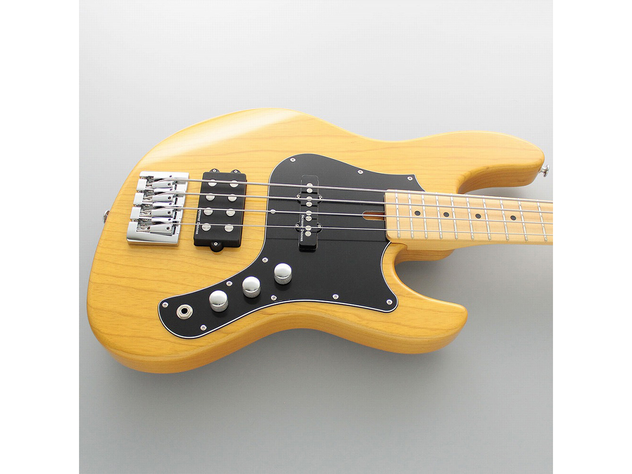 配列は、フロントにJタイプ、リアにMMタイプの組み合わせ。TONEポットのプッシュプルSWは、リアPUのコイルタップ機能になっており、ポットを引き上げることで擬似的にシングルPUのようなサウンドとなります。これにより、ピックアップ1発のMMタイプのような粘りのあるサウンドも出せますし、タップしてJBタイプのように歯切れのよいサウンドも出すことができます。