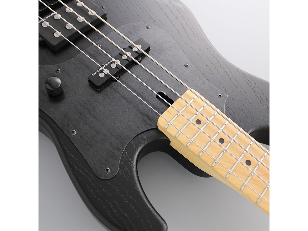 当モデルは、アッシュボディ、メイプル指板、オープンポアブラックカラーという組み合わせ。アッシュの導管の凹凸を活かした黒のつや消し仕上げが魅力の1本です。ボディカラーに合わせて、ヘッドもつや消しのブラックカラーにしました。
