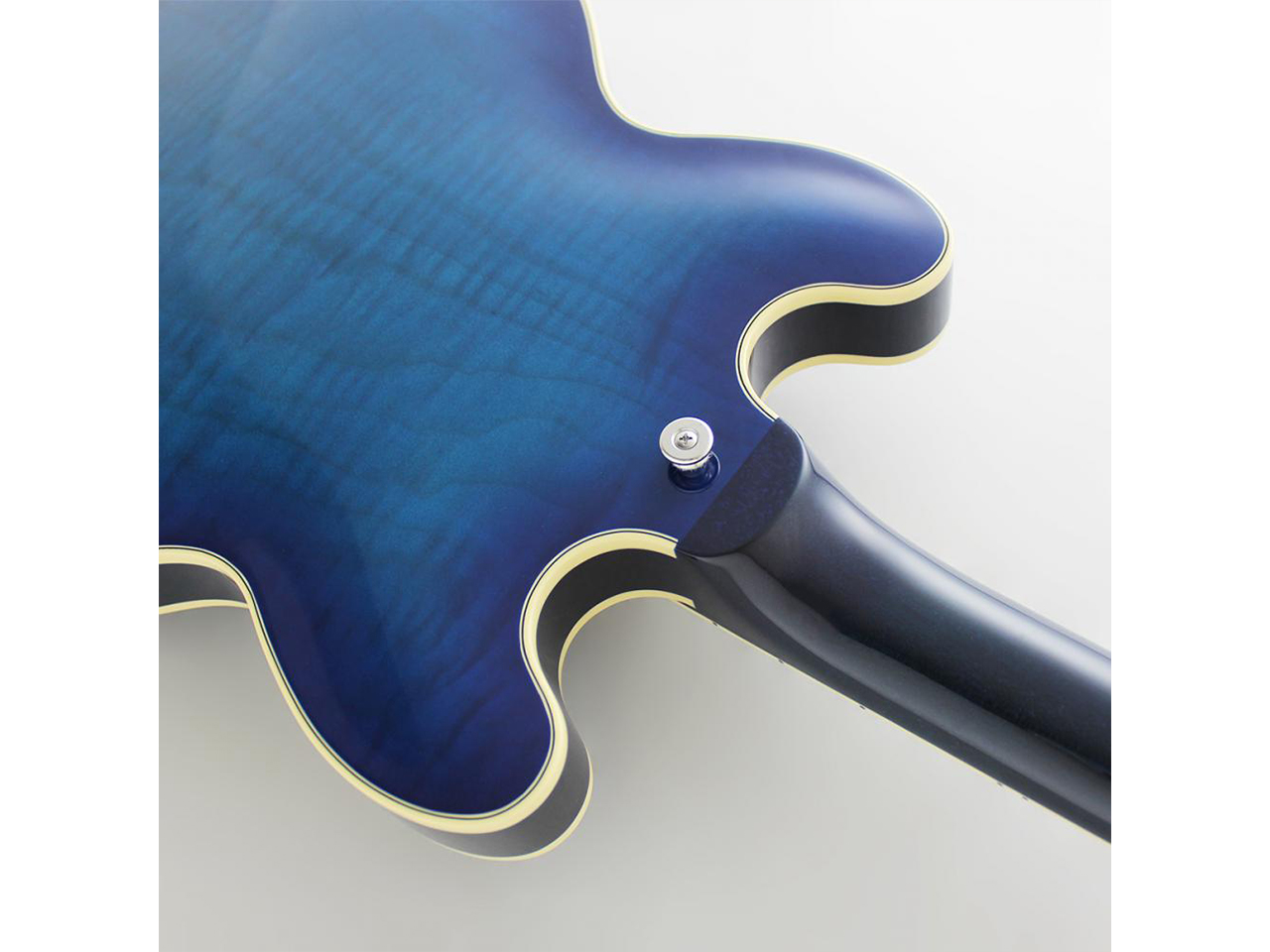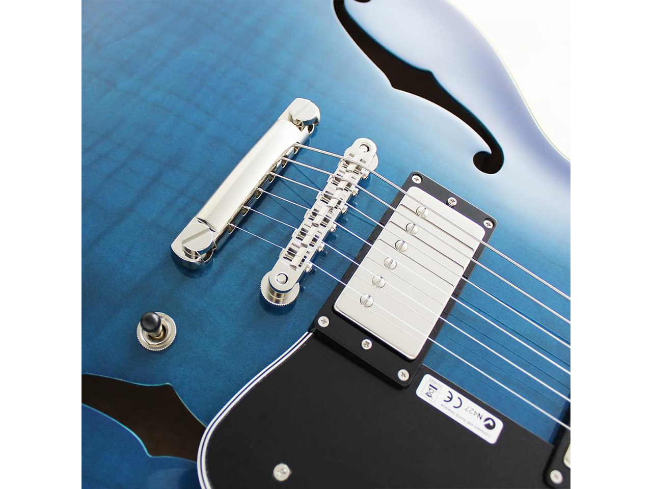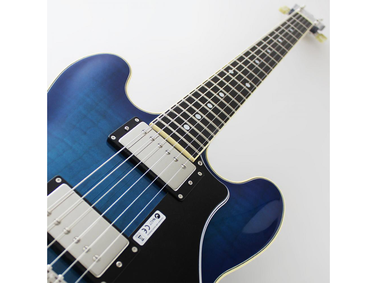 当モデルは、カーリーメイプルトップバック・マホガニーサイドボディ、ローズウッド指板、人気のブルーバーストカラーの組み合わせ。ハムバッカーピックアップを2基搭載したスタンダードなタイプです。