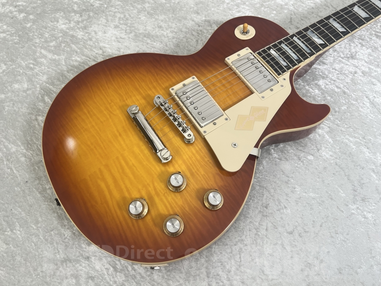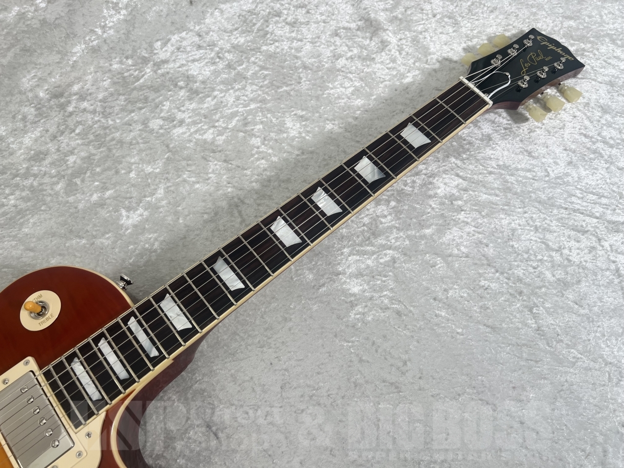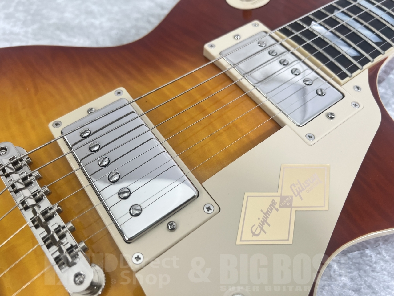 本モデルでは、ワンピース・マホガニー・ネック(ロング・ネック・テノン仕様)を採用し、豊かなサステインを実現。スリムテーパー™・ネック・プロファイルにより、スムーズな演奏性を提供します。さらに、バインディングが施されたローズウッド指板、マザー・オブ・パールのトラペゾイド・インレイ、エイジド加工を施したEpiphoneロゴ、ゴールドでシルクスクリーン印刷された「Les Paul Model」の文字が入ったギブソン・スタイルの“オープンブック”ヘッドストックを採用。サイド・ドットの位置やサイズも、1960年当時のLes Paul Standardと同じ仕様になっています。ジェニューイン・マホガニー材のボディにメイプル・トップが貼られ、トップには美しいAAAフレイムメイプル化粧板があしらわれています。