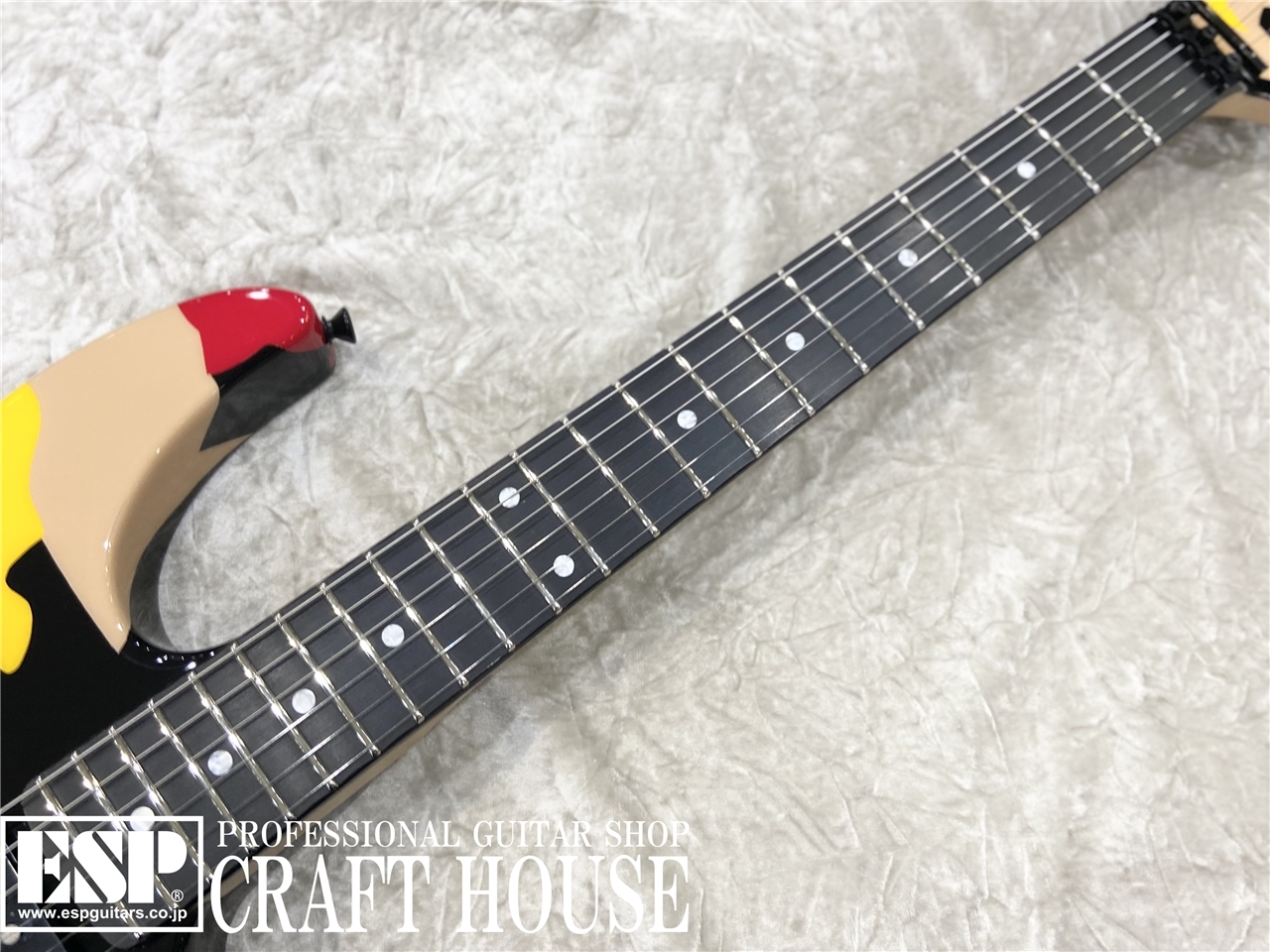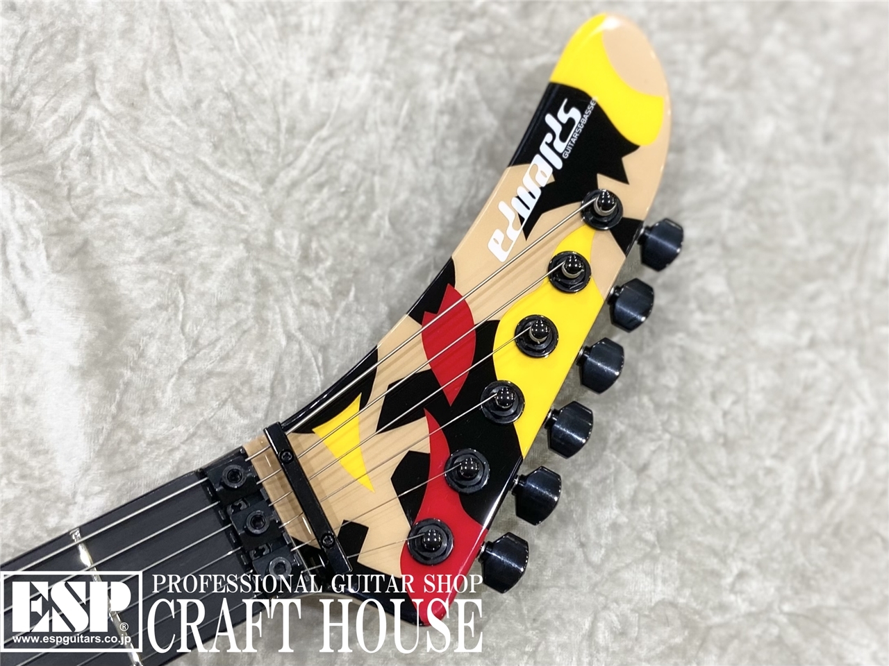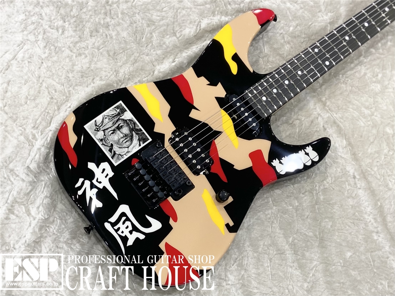 E-KAMIKAZE-Iは、特長的なカモフラージュグラフィックがボディトップとヘッドトップに採用されているモデルです。ボディはM-IIなどより一回り大きなGLシェイプとなっています。指板はエボニーが採用されています。ネックピックアップにはESP SS-120を搭載しています。ボリュームポットにはスイッチポットが使われており、ノブを引き上げるとネックピックアップへ切り替える事が出来ます。