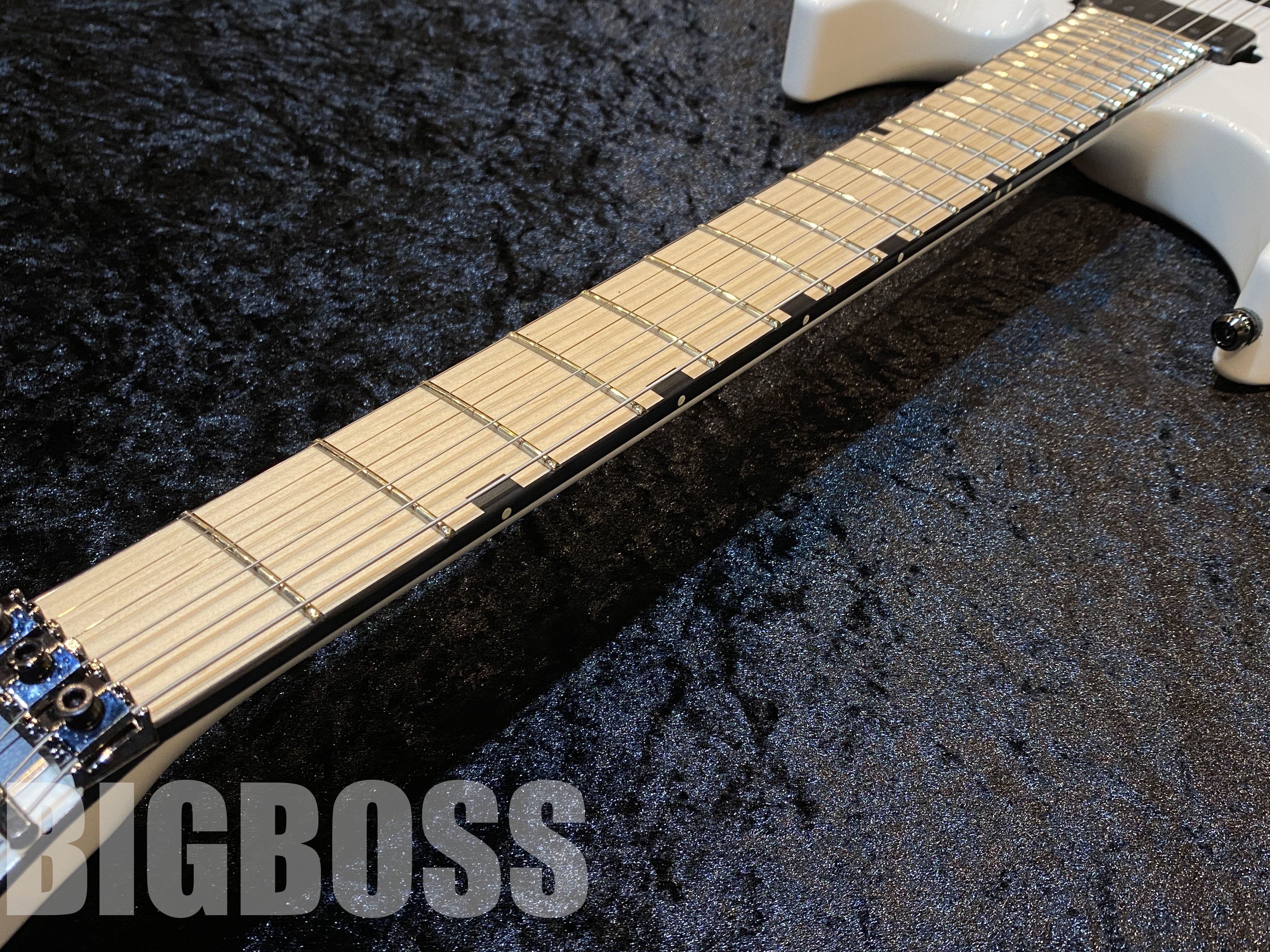 そして、指板にはよりブライトなサウンド傾向にあるメイプル指板をラインアップしました。サウンド以外にもルックスも大きく変化し、エボニー指板の場合は指板とヘッドにホワイトバインディングが施されていますが、メイプル指板の場合はコントラストを強調するブラックバインディングが施されています。